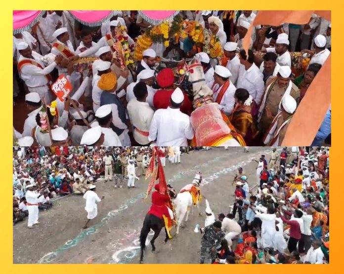 पुरंदवडे – आषाढी वारीच्या पार्श्वभूमीवर संतश्रेष्ठ श्री ज्ञानेश्वर माऊलींच्या पालखी सोहळ्याचे पुरंदवडे येथे भव्य गोल रिंगण भक्तिभावाने पार पडले. टाळ-मृदंगाचा गगनभेदी गजर, “माऊली-माऊली”चा अखंड नामस्मरणाचा जयघोष, पालखीभोवती फडफडणाऱ्या भगव्या पताका, ढगाळ आभाळ व अलोट गर्दी अशा वातावरणात माऊलींच्या अश्वाने रिंगणासाठी फेरी मारली आणि संपूर्ण परिसर हरिभक्तिमय झाला.