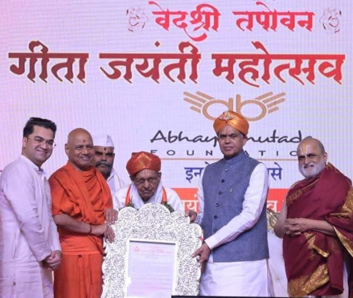 राज्यपाल म्हणाले वेदांचा सार उपनिषदांत आणि उपनिषदांचा सार गीतेत आहे. छत्रपती शिवाजी महाराजांनी भारतीय जीवनमूल्यांचा गौरव वाढविणाऱ्या विचारांची कास धरली. संत ज्ञानेश्वरांनी गीतेला जनभाषेत पोहोचवले आणि हजारो बालकांच्या मनात आध्यात्मिक चेतना जागवली. गीतेत मानवजीवनातील सर्व समस्यांचे निराकरण आहे. युवकांना गीतेचे शिक्षण दिल्यास ते व्यसनमुक्त, संयमी आणि मूल्यनिष्ठ जीवन जगू शकतात.