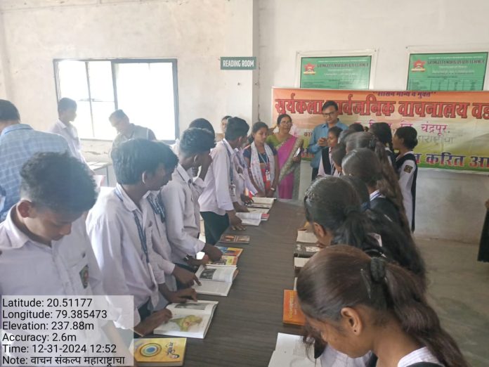 दिनांक 31 डिसेंबर 2024 रोजी सकाळी ठीक बारा वाजता ग्रामगीता महाविद्यालय चिमूर येथे सूर्यकला सार्वजनिक वाचनालय वडाळा पैकू यांच्या वतीने ग्रंथ प्रदर्शनी व वाचन स्पर्धा घेण्यात आली.