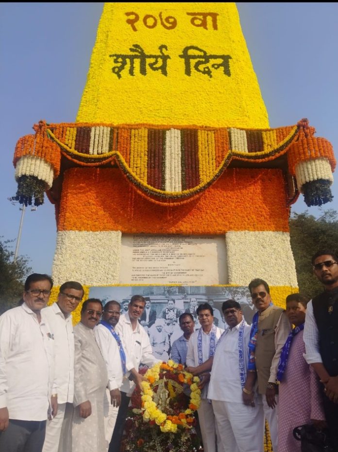भीमा-कोरेगाव शौर्य दिनानिमित्त शहीद वीरांना मानवंदना देत बसपाच्या पदाधिकाऱ्यांनी त्यांच्या ध्येयाने प्रेरित होऊन बहुजन समाजाच्या एकसंधतेचा निर्धार व्यक्त केला. यावेळी प्रदेश अध्यक्ष सुनील डोंगरे, किरण जी, महेश जगताप, अशोक गायकवाड, सिद्धार्थ कांबळे, सुशील गवळी, अनिल त्रिपाठी, संदीप कांबळे, प्रवीण वाकोडे, नागसेन माला, बाळासाहेब आव्हारे, संतोष सोनावणे यांचा सह प्रमुख पदाधिकारी आणि कार्यकर्ते उपस्थित होते.