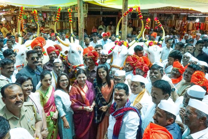 आळंदी : संत ज्ञानेश्वर माऊली पालखी सोहळ्यात रथाला जुंपण्यात येणाऱ्या मानाच्या बैलजोडींच्या अलंकापुरीनगरीत उत्साहात मिरवणूक पार पडली. यंदाची बैलजोडीची सेवा आळंदीतील अर्जुन घुंडरे, सचिन घुंडरे, विवेक घुंडरे, जनार्दन घुंडरे यांच्या घराण्याला मिळाला आहे. बैलजोडी मिरवणूक महाद्वारात आल्यानंतर नगरविकास राज्यमंत्री श्रीमती माधुरी मिसाळ यांच्या हस्ते बैलजोडीची पुजा करण्यात आली.