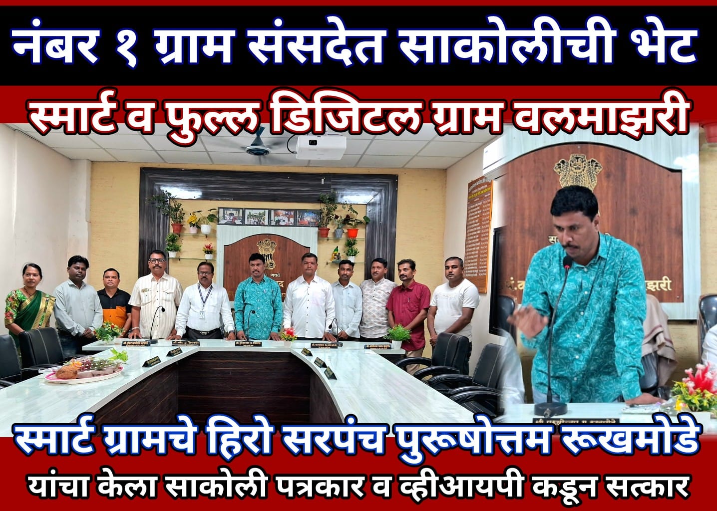 महाराष्ट्र राज्य पुरस्कार प्राप्त स्मार्ट व फुल्ल डिजिटल ग्राम म्हणजे साकोली तालुक्यातील वलमाझरीचे नाव घेतले जाते. येथील “ग्राम संसद” भवन असे वाटते की, एखाद्या दिल्ली भवनात आपण आलोय. आज रविवारी व्हीआयपी ग्रुप, साकोली मिडिया व फ्रिडम युथ फाऊंडेशनच्या संचालकांनी स्मार्ट ग्राम वलमाझरीचा दौरा काढला. संचालक अनिल कापगते, युवा सामाजिक कार्यकर्ता महेश पोगळे, आशिष चेडगे, किशोर बावणे, पत्रकार मनिषा काशिवार, ऋग्वेद येवले, शिक्षक हरिशचंद्र सोनवाने, रणविर कापगते यांनी या डिजिटल स्मार्ट गटग्रामपंचायतचे खरे पारदर्शक हिरो सरपंच पुरूषोत्तम रूखमोडे यांचा शाल श्रीफळ देत सत्कार करण्यात आला.
