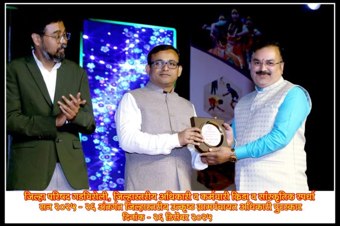धानोरा :- जिल्हा परिषद गडचिरोली अंतर्गत जिल्हास्तरीय अधिकारी व कर्मचारी क्रीडा व सांस्कृतिक स्पर्धा सन 2025 /26 नुकत्याच पार पडल्या. याच कार्यक्रमात जिल्ह्यातील प्रत्येक संवर्गातील उत्कृष्ट अधिकारी,कर्मचारी यांचा सन्मान करण्यात आला.