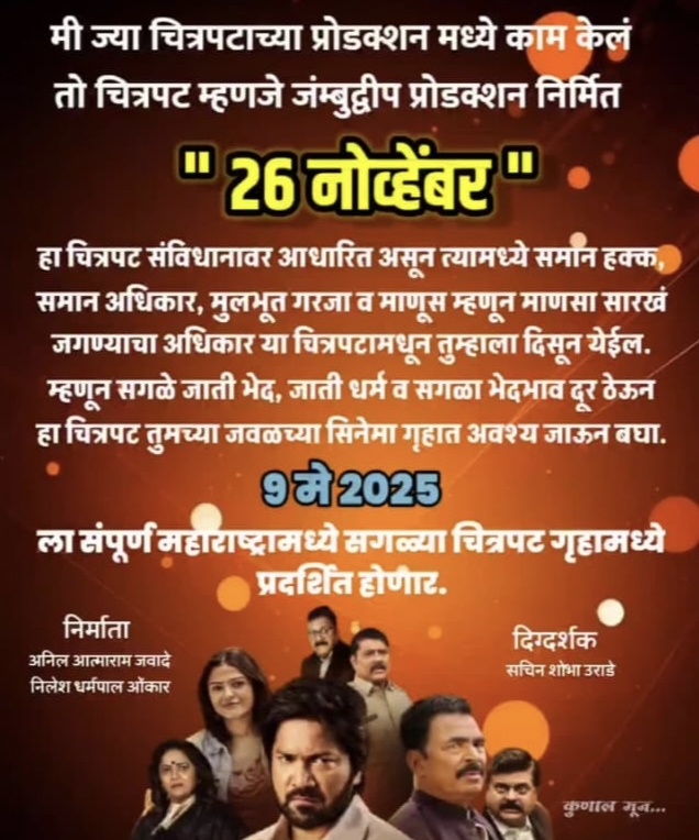 “26 नोव्हेंबर ” हा चित्रपटजम्बोद्वीप प्राडक्सन द्वारा निर्मित असुन या चित्रपटाचे निर्माते- अनिलकुमार जवादे, सहनिर्माते – निलेश ओनकार हे आहेत तर लेखक / दिग्दर्शक सचीन उराडे सर असुन या चित्रपटात प्रमुख भूमिकेत – अनिकेत विश्वासराव, सयाजीराव शिंदे, गणेश यादव, डॉ. विलास उजवणे, विजय पाटकर मुस्ताक खान, अंजली उजवने, भरत गोगावले या सारखी अनके नामवत कलाकारानी या चित्रपटात आपली भूमिका साकारलेली आहे.