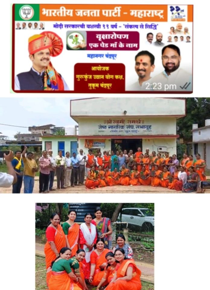 विद्यमान आमदार किशोर जोरगेवार यांच्या मार्गदर्शनात भारतीय जनता पार्टीचे अध्यक्ष सुभाष कासंगोट्टूवार यांच्या अध्यक्षतेखाली गुरुकुंज उद्यान येथे मोदी सरकार के यशस्वी 11 वर्ष ‘संकल्प से सिद्धी’ तसेच महाराष्ट्राचे मुख्यमंत्री देवेन्द्र फडनविस यांच्या वाढदिवस सप्ताह निमित्त एक पेड़ माँ के नाम या कार्यक्रमाचे आयोजन भारती जनता पार्टी महिला मोर्चा चंद्रपूर जिल्हा सोशल मिडीयाच्या संयोजिका सुवर्णा ताई लोखंडे यांनी केले होते.
