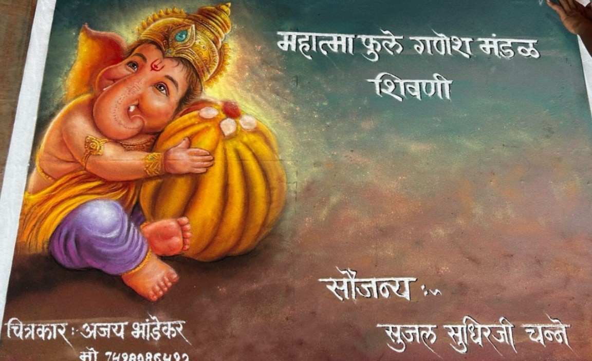 सिंदेवाही ( शिवणी) :- गणेशउत्सवा निमित्त महात्मा फुले गणेश मंडळ शिवणीच्या वतीने विविध कला गुणांना वाव मिळावा व वेगवेगळ्या प्रकारच्या चित्रकलेची, रंगकामाची गावातील, परिसरातील विद्यार्थाना ,कलाकारांना माहिती मिळावी यासाठी गणपती बाप्पाचे रांगोळीने अप्रतिम असे चित्र साकार करून गावातील सर्व भाविकांचे मन मंडळाने जिंकले.