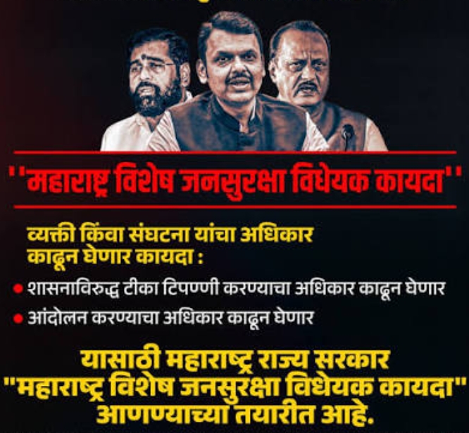 महाराष्ट्र राज्यातील राज्यकर्ते आणि आरएसएसचे विशेष पदाधिकारी,भारतातील भांडवलदार,देशातील ब्राह्मणवादी एवढे घाबरले आहेत की,”महाराष्ट्र विशेष जनसुरक्षा अधिनियम,कायद्यांतर्गत सरकारच्या विरोधात बोलणाऱ्यांना अटक करु इच्छितात असा आरोपही अभ्यासू नागरिकांचा आहे…