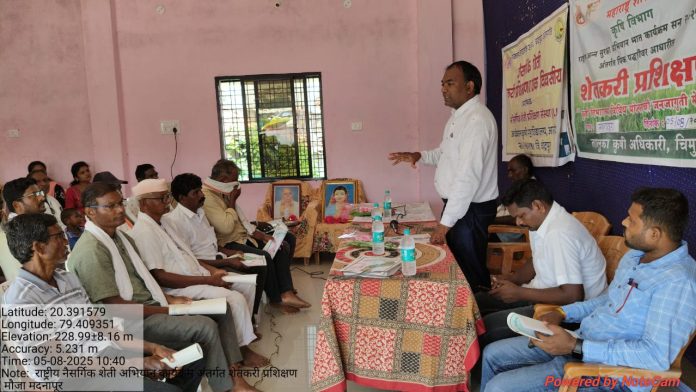 कृषी तंत्रज्ञान व्यवस्थापन यंत्रणा (आत्मा) मार्फत आनंदनिकेतन कृषी महाविद्यालय वरोरा यांच्या वतीने राष्ट्रीय नैसर्गिक शेती मिशन अभियानांतर्गत मा. तालुका कृषी अधिकारी चिमूर पुजारी यांच्या मार्गदर्शनाखाली काल दि.05/08/025 रोजी मौजा मदनापूर येथे शेतकरी प्रशिक्षण कार्यक्रमाचे आयोजन करण्यात आले.