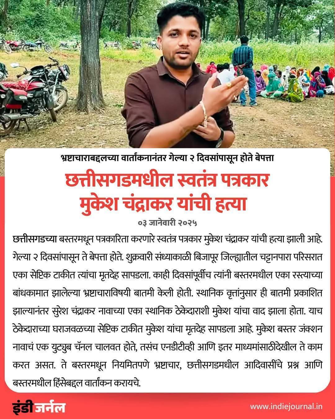 गडचिरोली :- छत्तीसगड येथील NDTV चे पत्रकार मुकेश चंद्रकार यांची निर्घुण हत्या करण्यात आली त्यांच्या हत्येचा निषेधार्थ उर्वरीत मारेकऱ्यांना पोलीसांनी पकडून कठोर शिक्षा घ्यावी या मागणीसाठी गडचिरोली येथे पत्रकारांचा मुक मोर्चा गुरुवार दि. ०९ जानेवारी २०२४ ला दुपारी १२ वाजता मोर्च्याचे आयोजन करण्यात आलेले आहे.
