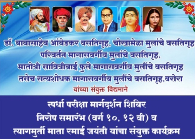 भद्रावती :- डॉ.बाबासाहेब आंबेडकर वसतिगृह,चौखामेळा मुलांचे वसतिगृह,परिवर्तन मागासवर्गीय मुलांचे वसतिगृह,मातोश्री सावित्रीबाई फुले मागासवर्गीय मुलांचे वसतिगृह तसेच सत्यशोधक मागासवर्गीय मुलांचे वसतिगृह,वरॊरा यांच्या संयुक्त विद्यमाने स्पर्धा परीक्षा मार्गदर्शन शिबिर,निरोप समारंभ (वर्ग १० वी व १२ वी) व त्यागमूर्ती माता रमाई जयंतीचा संयुक्त कार्यक्रम आयोजित करण्यात आला आहे.