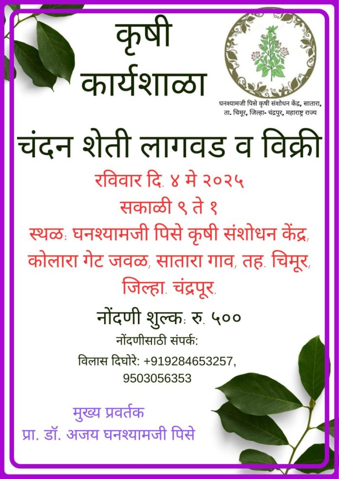 चंदनाची शेती करण्यास उत्सुक असलेल्या शेतकऱ्यांना घनश्यामजी पिसे कृषी संशोधन केंद्रामार्फत मार्गदर्शन करण्यात येत आहे याचा लाभ शेतकऱ्यांनी अवश्य घ्यावा असे आवाहन प्रा. डॉ. अजय घनश्यामजी पिसे यांनी केले आहे. अधिक माहितीसाठी ९५०३०५६३५३ या क्रमांकाशी संपर्क साधावा.