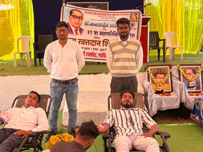 हेल्पिंग हँड बहुउद्देशीय संस्था व बौद्ध समाज धानोरा यांच्या संयुक्त विद्यमाने डॉ. बाबासाहेब आंबेडकर यांच्या महापरिनिर्वाण दिनानिमित्त रक्तदान शिबिराचे आयोजन करण्यात आले. “रक्तदान हेच श्रेष्ठ दान” या भावनेने प्रेरित होऊन नागरिकांनी उत्स्फूर्त प्रतिसाद देत मोठ्या संख्येने रक्तदान केले आणि बाबासाहेबांना खरी आदरांजली वाहिली.