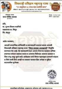 सामाजिक बांधिलकी व समाजाप्रती तत्परता बघता,”शिवशाही प्रतिष्ठान महाराष्ट्र राज्य चे संस्थापक अध्यक्ष राज गोविंद जाधव यांनी शुभम गजभिये यांची चिमूर तालुका अध्यक्षपदी नियुक्ती केली आहे.
