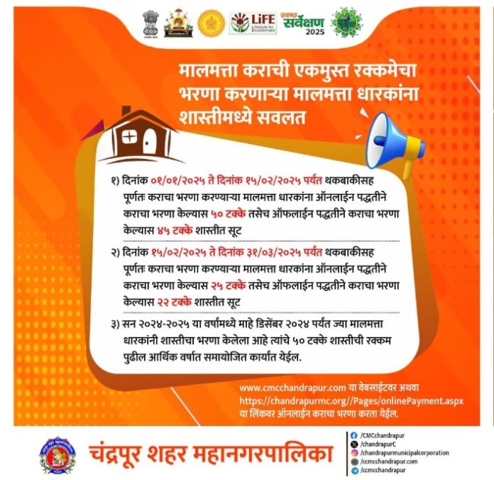 चंद्रपूर महानगरपालिकेतर्फे 15 फेब्रुवारी पर्यंत थकबाकीसह मालमत्ता कराचा एकरकमी भरणा करणाऱ्याना शास्तीत सवलत देण्यात येत ऑनलाईन पद्धतीने कराचा भरणा केल्यास 50 टक्के तसेच ऑफलाईन पद्धतीने कराचा भरणा केल्यास 45 टक्के शास्तीत सवलत देण्यात येत आहे.