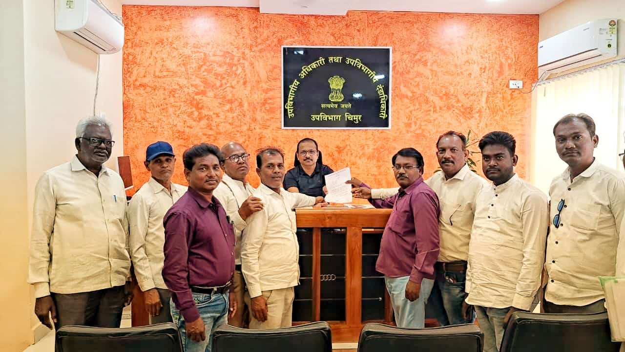चिमूर उपविभागीय अधिकारी किशोर घाडगे यांना निवेदन देताना समितीचे अध्यक्ष आयु.विलास राऊत, सचिव शुभम मडपे,कोषाध्यक्ष प्रशांतकुमार देठे,राजू अलोने,उत्तम रामटेके,प्रियानंद गेडाम,गोपी घुटके,झामानंद धनविजय,मनोज राऊत,किशोर घोनमोडे,शालीक थुल,राजू घोनमोडे,रंजीत पाटिल,गुलाब गणविर,निलेश्वर कोसे,विलास राऊत,दिलीप दिठे,शुभम मंडपे,नारायण कांबळे,प्रशांत देळे,रामचंद्र गेडाम,शिवराम मेश्राम,रामराव नन्नावरे,आदींची उपस्थित होते.