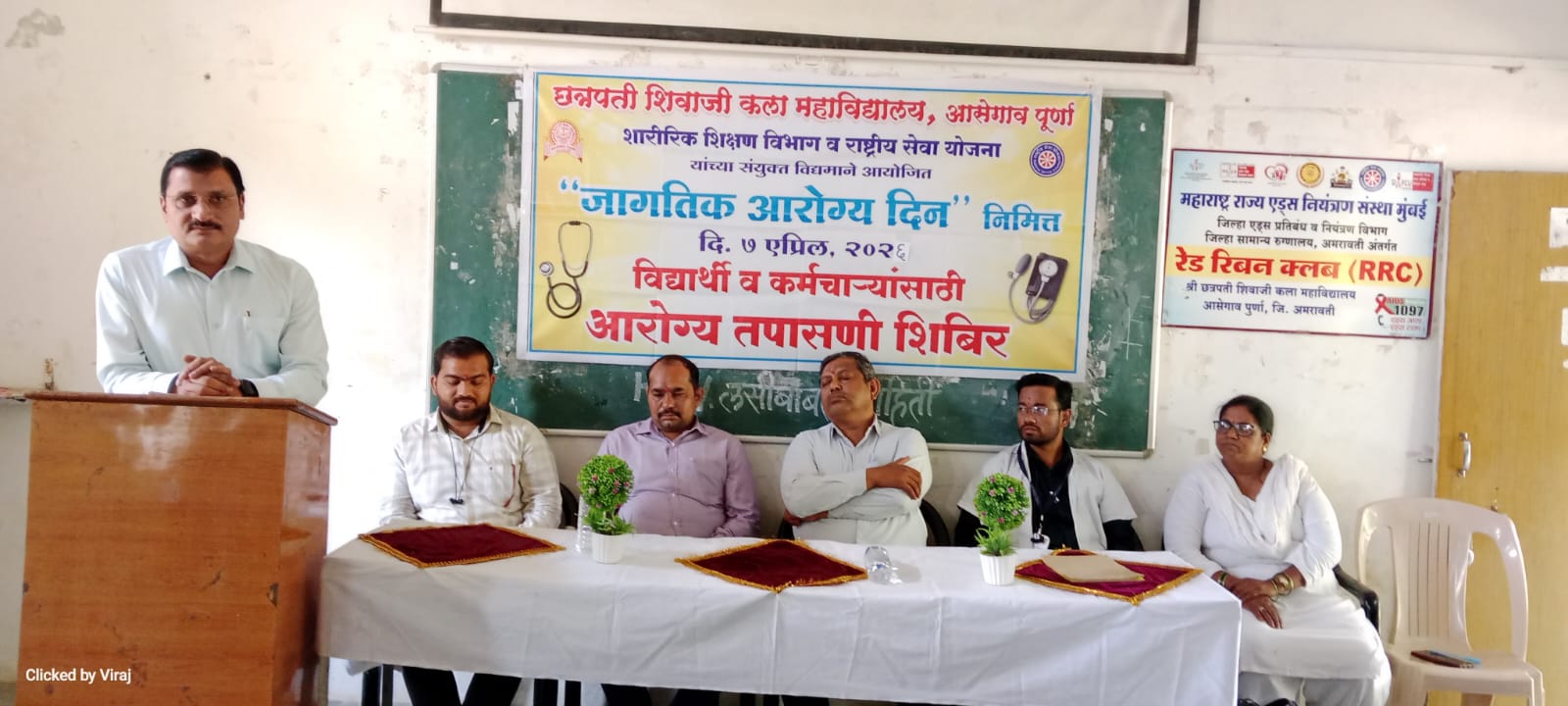 तसेच कर्मचारी यांचेही आरोग्य सुस्थितीत ठेवणे, हे महाविद्यालयाचे कर्तव्य आहे, यासर्व गोष्टीचा आढावा लक्षात घेता संत गाडगेबाबा अमरावती विद्यापीठ संलग्नित छत्रपती शिवाजी कला महाविद्यालय आसेगाव पूर्णा येथे शारीरिक शिक्षण विभाग, राष्ट्रीय सेवा योजना, रेड रिबन क्लब, गृहअर्थशास्त्र विभाग व प्राथमिक आरोग्य केन्द्र संयुक्त विद्यमाने 7 एप्रिल रोजी जागतिक आरोग्य दिन साजरा करण्यात आला.