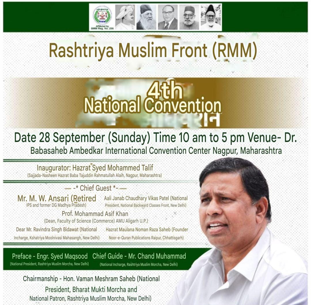 President of the National Convention will be Ma. Vaman Meshram Saheb (National President, Bharat Mukti Morcha and National Patron, Rashtriya Muslim Morcha, New Delhi).