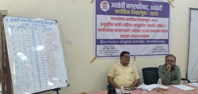 आळंदी : आगामी आळंदी नगरपरिषद निवडणुकीसाठी आज प्रशासनाकडून प्रभागनिहाय आरक्षणाची घोषणा करण्यात आली. या आरक्षण सोडतीनंतर नगरपरिषदेतील राजकीय समीकरणे बदलण्याची शक्यता निर्माण झाली आहे.