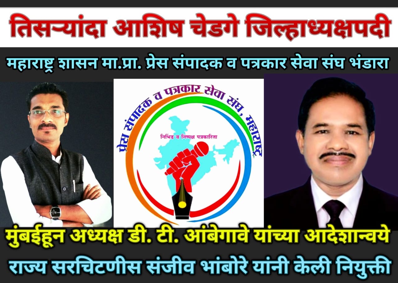 भंडारा : महाराष्ट्र शासन मान्यताप्राप्त प्रेस संपादक व पत्रकार सेवा संघ महाराष्ट्र राज्य संस्थापक अध्यक्ष डी. टी. आंबेगावे यांच्या आदेशान्वये भंडारा जिल्ह्यातील साकोलीचे निर्भिड पत्रकार व दै. युवाराष्ट्र दर्शन प्रतिनिधी आशिष चेडगे यांची बेधडक निर्भिड व जनहितार्थ पत्रकारिता बघता भंडारा जिल्हा अध्यक्षपदी तिसऱ्यांदा त्यांची निवड राज्य सरचिटणीस संजीव भांबोरे यांनी केली आहे.