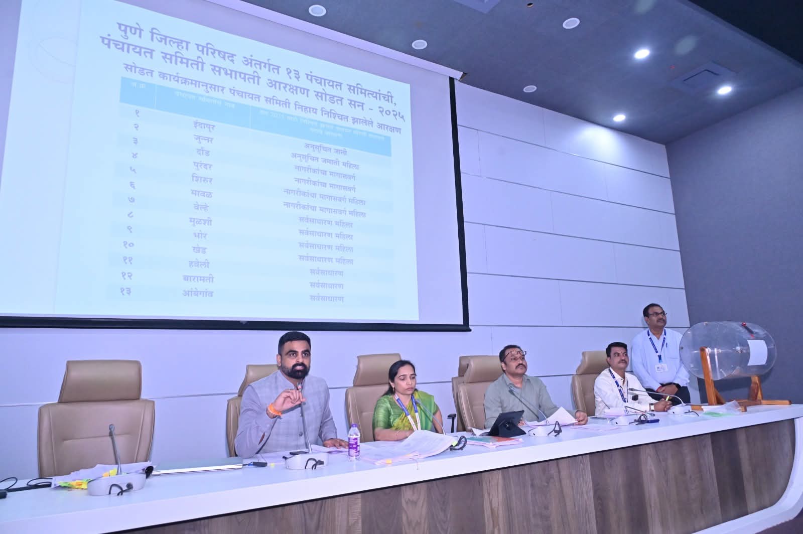 पुणे : जिल्हाधिकारी जितेंद्र डुडी यांच्या अध्यक्षतेखाली जिल्हा परिषद क्षेत्रातील १३ पंचायत समित्यांच्या सभापती पदांची आरक्षण सोडत बहुउद्देशीय सभागृह, ५ वा मजला, जिल्हाधिकारी कार्यालय येथे प्रक्रिया पूर्ण करुन जाहीर करण्यात आले.