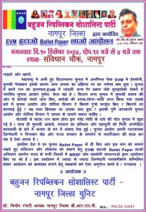 इसलिए देश मे हर चुनाव Bailet Paper से ही किए जाए इस मांग को सामने रखते हुए संविधान और लोकतंत्र को बचाने हेतु EVM हटाओ Bailet Paper लाओ अभियान अंतर्गत राज्य के सभी जिल्हों में BRSP और सहयोगी संघटनाओ द्वारा आंदोलन किए जा रहे है।इस आंदोलन में ज्यादा से ज्यादा जिम्मेदारी नागकरीकोने सम्मिलित होकर आंदोलन को कामयाब बनाने हेतू सहकार्य करे ऐसा अणुरोध करते है।