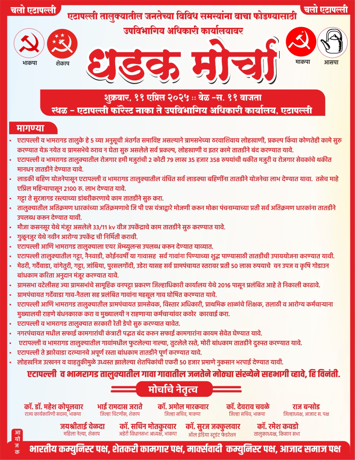 भारतीय कम्युनिस्ट पक्ष, शेतकरी कामगार पक्ष, मार्क्सवादी कम्युनिस्ट पक्ष, आझाद समाज पक्ष व किसान सभेच्या वतीने 5 व्या अनुसूची अंतर्गत समाविष्ट असलेल्या एट्टापल्ली व भामरागड तालुक्यात ग्रामसभेच्या ठरवाशिवाय लोहखाणी, प्रकल्प किंवा कोणतेही कामे सुरु करण्यात येऊ नयेत व ग्रामसभेचे ठराव न घेता सुरु असलेले सर्व प्रकल्प, लोहखाणी व इतर कामे तातडीने बंद करण्यात यावे. एटापल्ली व भामरागड तालुक्यातील रोजगार हमी मजुरांची 2 कोटी 79 लाख 35 हजार 358 रुपयांची थकीत मजुरी व रोजगार सेवकांचे थकीत मानधन तातडीने देण्यात यावे.