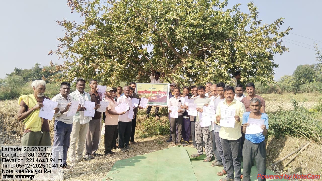 आज तालुका कृषी अधिकारी कार्यालय कुरखेडा यांच्या वतीने भगवानपुर येथे जागतीक मृदा दिनाच्या निमित्ताने शेतकरी सभा आयोजित उपस्थित शेतकऱ्यांना माती परीक्षणाचे महत्त्व, जमीन सुपीकता निर्देशांक व जमीन आरोग्य पत्रिका आधारित खतांचा संतुलित वापर, एकात्मिक अन्नद्रव्य व्यवस्थापन, सेंद्रिय खते तसेच हिरवळीचे खते वापरण्याचे फायदे , माती नमुना घेण्याचे प्रात्यक्षिक व त्याची पद्धती याबाबत सहाय्यक कृषी अधिकारी कनिष्क वाघमारे यांनी सविस्तर माहिती देऊन मार्गदर्शन केले.