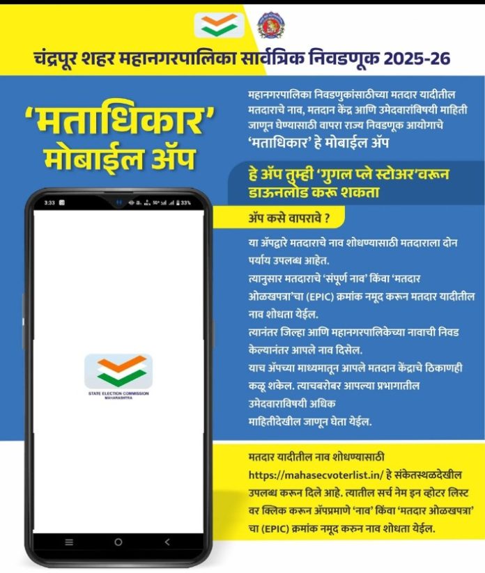 चंद्रपूर ११ जानेवारी – चंद्रपूर महानगरपालिका सार्वत्रिक निवडणुकीसाठी दिनांक १५ जानेवारी २०२६ रोजी महानगरपालिका क्षेत्रातील मतदारांना सकाळी ०७:३० ते सायंकाळी ०५:३० या वेळेत मतदान करायचे आहे. मतदान प्रक्रियेस सुलभता मिळावी, यासाठी प्रत्येक मतदाराने आपले नाव मतदार यादीत आहे की नाही व आपले मतदान केंद्र कोणते आहे, याची माहिती आधीच करून घेणे आवश्यक आहे. यासाठी मतदारांना आपले नाव व मतदान केंद्र शोधण्यासाठी तीन पर्याय उपलब्ध आहेत.