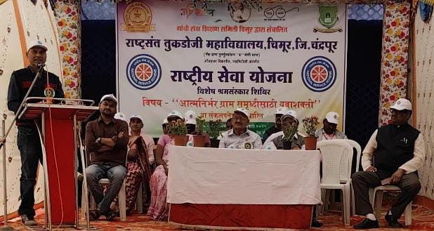 चिमूर :- स्थानिक गांधी सेवा शिक्षण समिती द्वारा संचालित राष्ट्रसंत तुकडोजी महाविद्यालय राष्ट्रीय सेवा योजनेचे श्रमसंस्कार शिबिर चे उद्घाटन दिनांक ११ जानेवारीला संपन्न झाले. हे निवासी शिबिर आत्मनिर्भर ग्राम समृद्धी साठी युवाशक्ती या संकल्पनेवर आधारित आहे. उद्घाटक म्हणून पराग शंभरकर कामगार अधिकारी राज्य परिवहन महामंडळ,भंडारा हे उपस्थित होते.