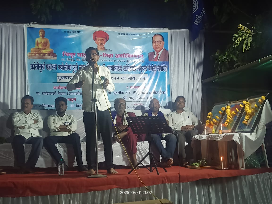 चिमूर तालूका ई रिक्षा असोशिएशनच्या वतीने क्रांतीसुर्य महात्मा ज्योतीबा फुले तथा विश्वरत्न डॉ.बाबासाहेब आंबेडकर यांचा संयुक्त जयंती समारोह दि.११ एप्रील शुक्रवार ला सायंकाळी तहसिल कार्यालय चिमूर जवळ पार पडला.