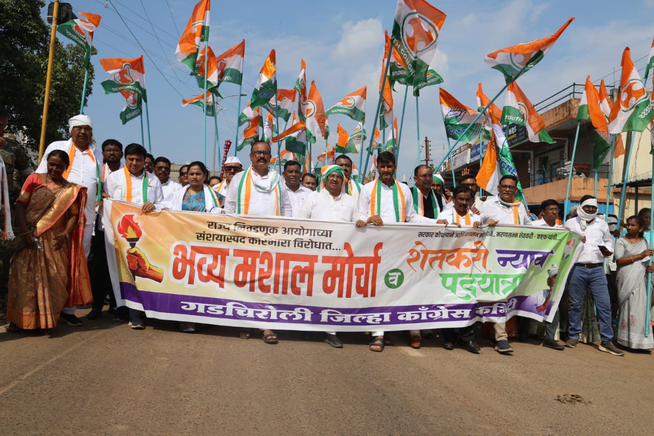 विधानसभा निवडणुकीतील मतचोरीची चौकशी करावी यासाठी काँग्रेस पक्षाने आजपासून राज्यभर मशाल मोर्चे काढण्याचे निश्चित केले होते.आज गडचिरोलीत प्रांताध्यक्ष हर्षवर्धन सपकाळ यांच्या नेतृत्वाखाली मशाल मोर्चा व शेतकरी न्याय पदयात्रा काढण्यात आली.