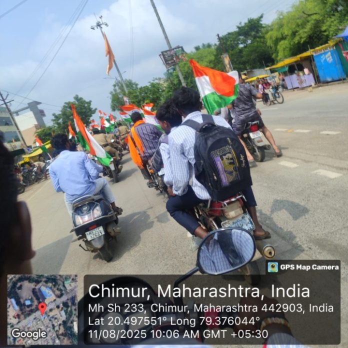या मोहिमेच्या एक भाग म्हणून चिमूर नगरपरिषद क्षेत्रातील नागरिकांमध्ये ‘हर घर तिरंगा’- ‘हर घर स्वच्छता’ मोहिमेची जनजागृती करण्याकरिता,दिनांक 11 ऑगस्ट 2025 रोज सोमवारला सकाळी 9:00 वाजता, नगरपरिषद चिमूर द्वारा जनजागृती बाईक रॅली आयोजित करण्यात आली होती.