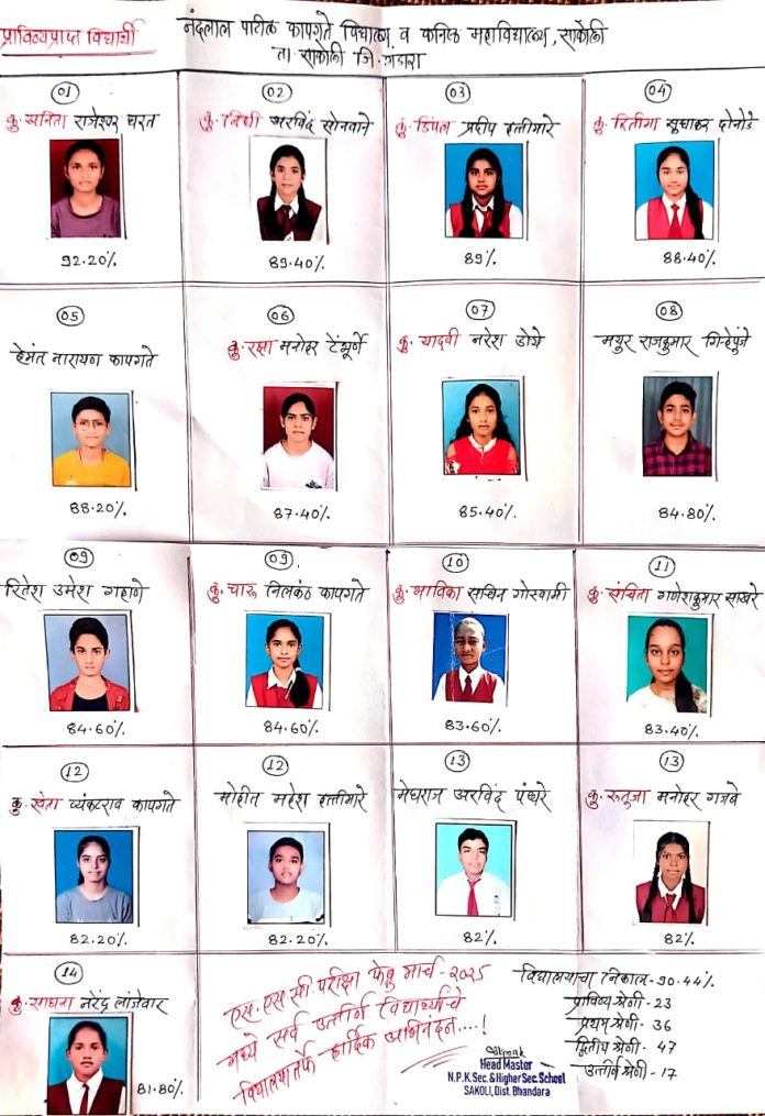 साकोली : येथील नंदलाल पाटील कापगते विद्यालय साकोली या शाळेने यंदाही दहावीच्या निकालात यशाची परंपरा कायम ठेवत उत्तुंग यश संपादन केले आहे. शाळेचा एकूण निकाल 90.44 % लागले असून, अनेक विद्यार्थ्यांनी उत्कृष्ट गुण मिळवून शाळेचे नाव उज्वल केले आहे.