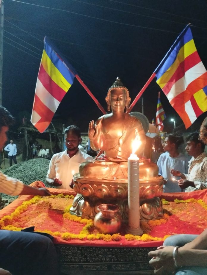 यावेळी विहारापासून ते गावातील मुख्य रस्त्याने तथागतच्या बुद्ध मूर्तीसह जयघोष करत,हातात मेणबत्ती पकडून शांततामय मिरवणूक सुगतकुटी कडे मार्गक्रमण करण्यात आले.