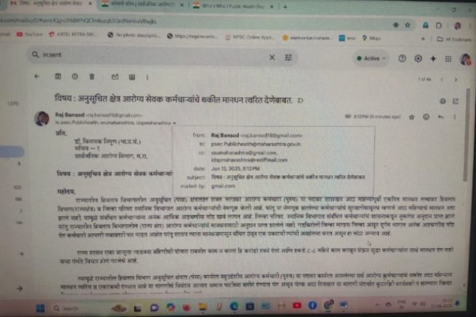त्यामुळे राज्यातील हिवताप विभाग अनुसूचित क्षेत्रात (पेसा) कार्यरत बहुउद्देशीय आरोग्य कर्मचारी (पुरुष) या पदावर कार्यरत असलेल्या सर्व आरोग्य कर्मचाऱ्यांचे थकीत आठ महिन्याचे मानधन त्वरित व एकरकमी देण्यात यावे ही मागणी email द्वारे सार्वजनिक आरोग्य विभागाचे सेक्रेटरी डॉ. निपुण विनायक यांचेकडे केली असल्याचे राज बन्सोड जिल्हाध्यक्ष, आजाद समाज पार्टी गडचिरोली यांनी म्हटले आहे.