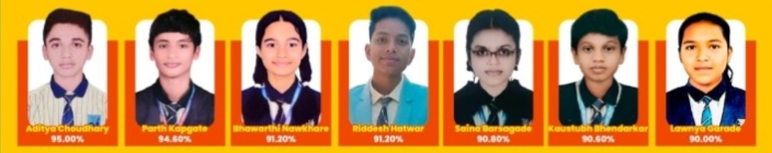 या यशामध्ये आदित्य चौधरी ९५% गुणांसह शाळेत प्रथम, पार्थ कापगते ९४.६०% गुणांसह द्वितीय, भावार्थी नवखरे व रिद्धेश हटवार दोघेही ९१.२०% गुणांसह तृतीय,