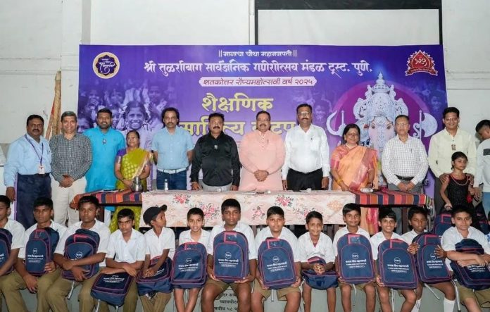 पुणे – पुण्यातील मानाचा चौथा गणपती श्री तुळशीबाग सार्वजनिक गणेशोत्सव मंडळ ट्रस्टतर्फे शतकोत्तर रौप्य महोत्सवी वर्षानिमित्त गरजू विद्यार्थ्यांना शालेय साहित्याचे वाटप करण्यात आले.