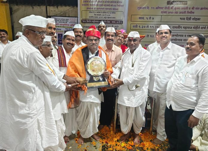 आळंदी : श्री संत ज्ञानेश्वर महाराज समाधी मंदिर शिखरावर २२ किलो सुवर्ण कलशारोहनाचा ऐतिहासिक संकल्प यशस्वीपणे पूर्ण झाल्याबद्दल श्री ज्ञानेश्वर महाराज संस्थान कमिटीचे विश्वस्त ह.भ.प.चैतन्य महाराज कबीरबुवा यांना “वैष्णव सेवा पुरस्कार” प्रदान करून सन्मानित करण्यात आले.