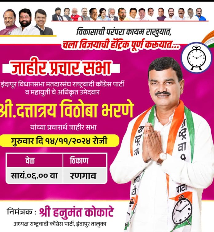 इंदापूर तालुका विधानसभा मतदारसंघ उपमुख्यमंत्री अजितदादा पवार राष्ट्रवादी काँग्रेस पार्टी व महायुतीचे अधिकृत उमेदवार दत्तात्रेय मामा भरणे यांची जाहीर सभा आज रणगाव येथे होणार आहे.