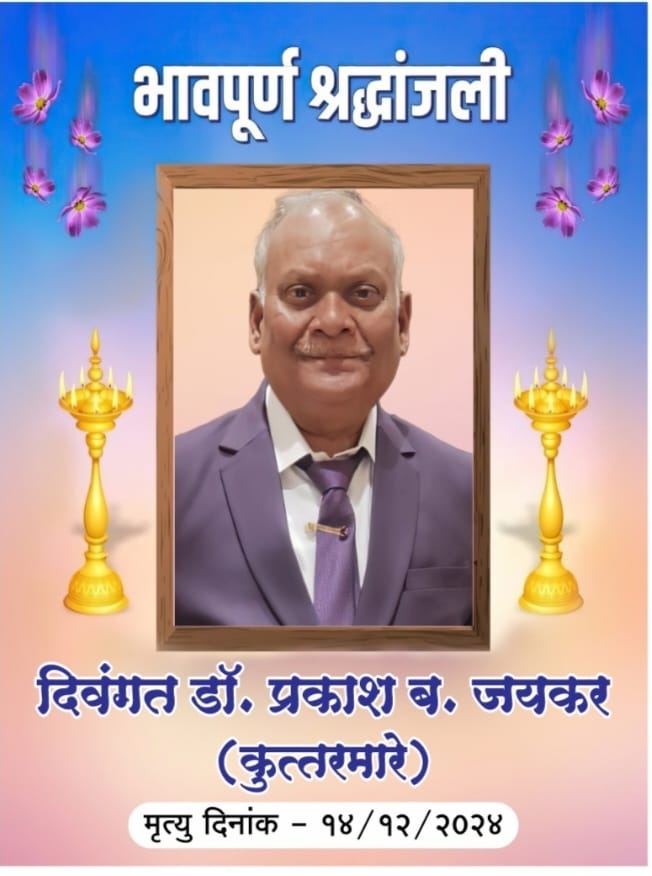 चिमूर भाजप महिला आघाडी च्या प्रियाताई जयकर यांचे पती डॉ. प्रकाश जयकर (वय ६५ वर्ष )यांचे नागपूर येथील खाजगी रुग्णालयात सकाळी १०. ३०वा निधन झाले.