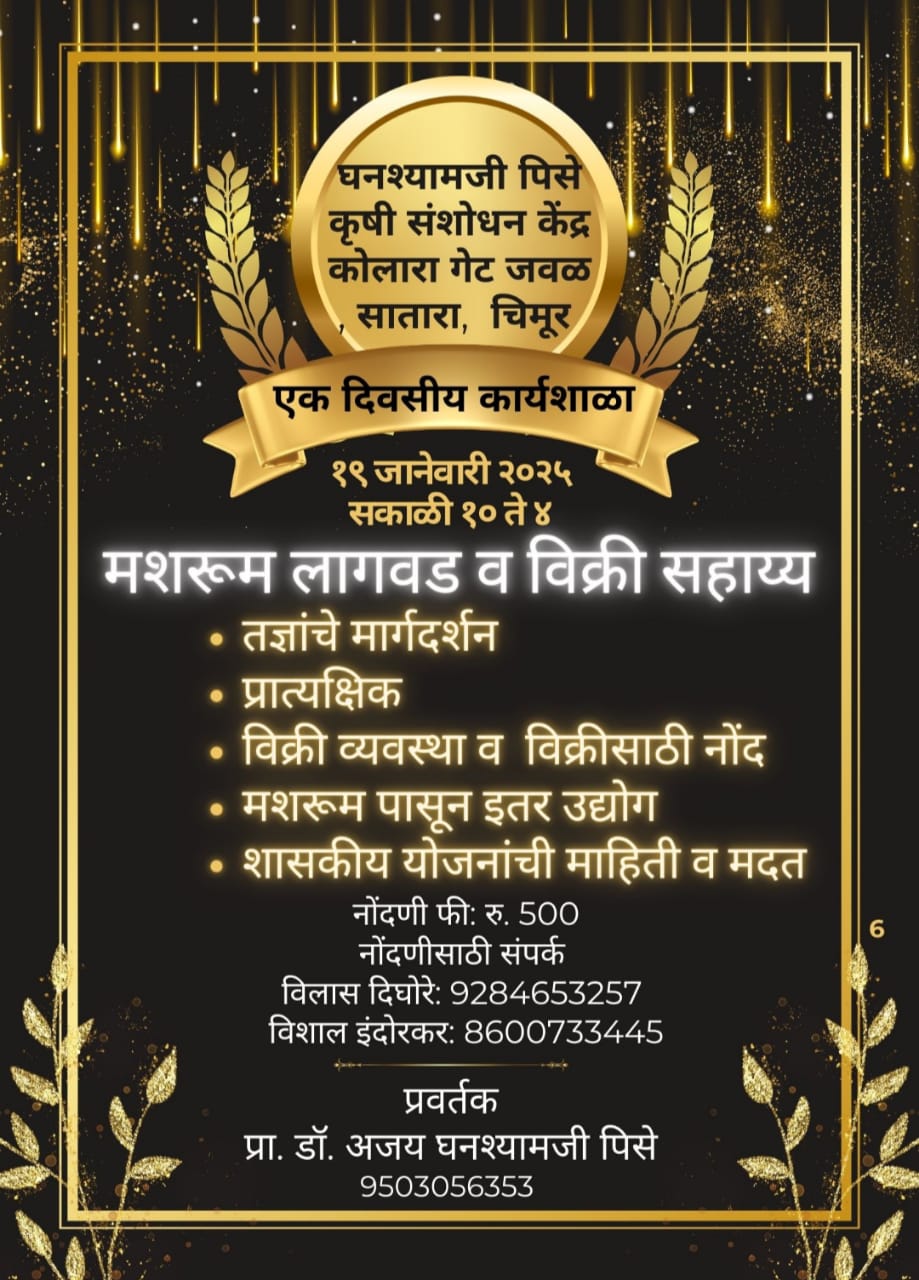 चिमूर तालुक्यातील कोलारा गेट सातारा येथील घनश्यामजी पिसे कृषी संशोधन केंद्रात दि. १९ जानेवारीला एक दिवसीय मशरूम लागवड व विक्री सहाय्य कार्यशाळेचे आयोजन करण्यात येत आहे.