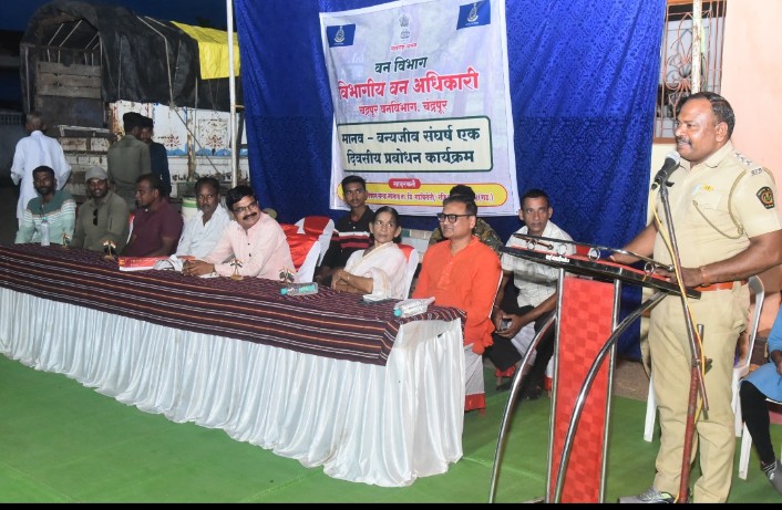 तरीही चंद्रपूर जिल्ह्यात मानव वन्यजीव संघर्षाच्या घटना वारंवार घडत आहे यावर आळा बसवून सतत होणारी जीवितहानी कमी करण्याचे दृष्टिकोनातून शेतकरी गुराखी शेतमजूर व सर्वसामान्य नागरिकांच्या सहकार्याशिवाय शक्य नाही म्हणून सावली वनपरिक्षेत्रात श्री विनोद धुर्वे वनपरीक्षेत्र अधिकारी सावली यांनी श्री प्रशांत खाडे विभागीय वनाधिकारी चंद्रपूर, व विकास तरसे सहाय्यक वनसंरक्षक चंद्रपूर यांचे मार्गदर्शनाखाली चंद्रपूर वनविभाग चंद्रपूर व मनोरमा बहुउद्देशीय विकास संस्था नवेगाव यांचे संयुक्त विद्यमाने दिनांक 13.6.25 ते 16.6.2025 चे दरम्यान चितेगाव, गेवरा, टेकाडी व सिरसी येथे मानव वन्य जीव संघर्षावर आधारित कलापथकाद्वारे जनजागृती पर कार्यक्रम पार पडले.