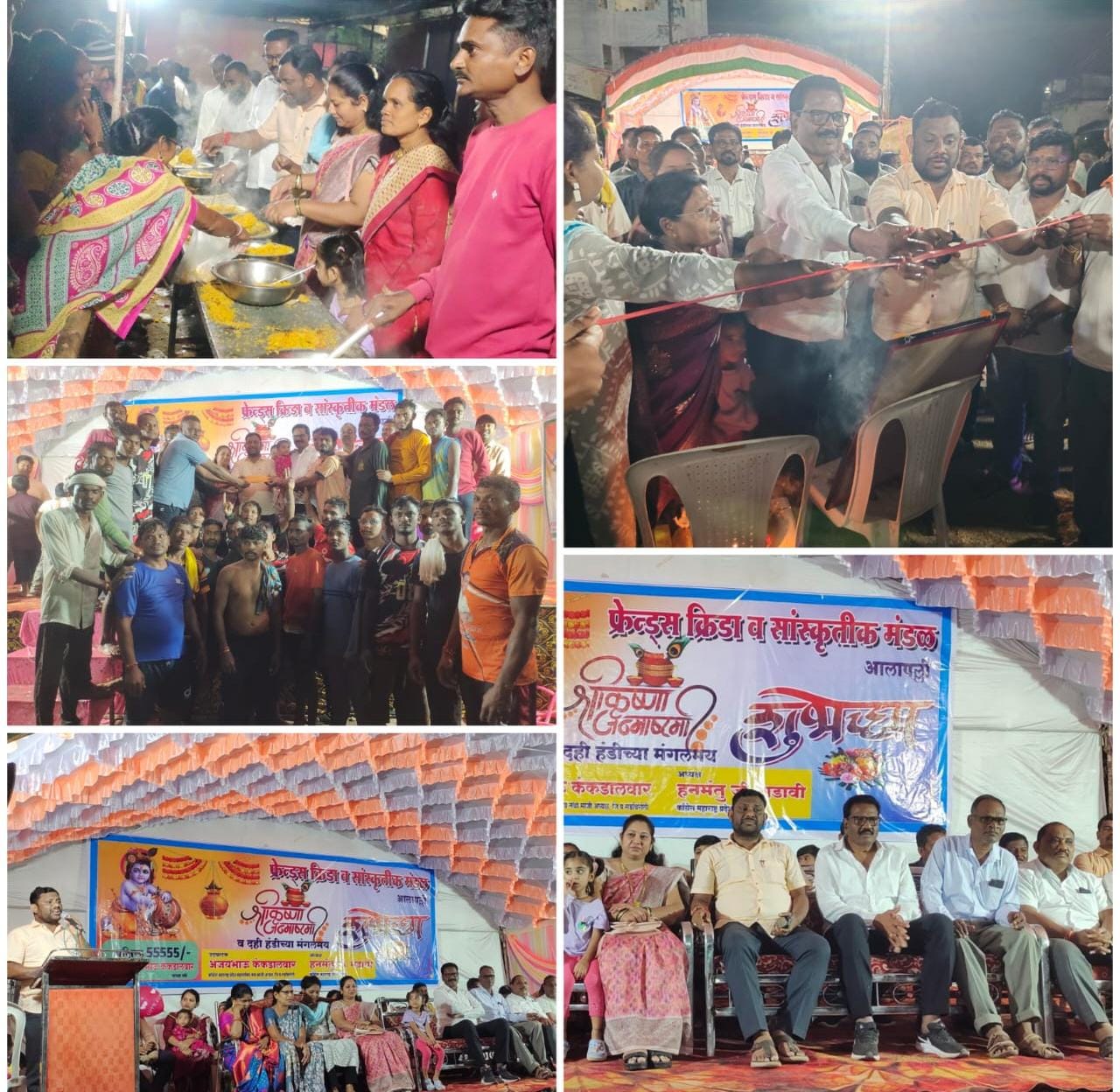 त्यावेळी दहीहंडी स्पर्धेठिकाणी भाविक तसेच नागरिकांना माजी जि.प.अध्यक्ष अजयभाऊ कंकडालवार आणि महाराष्ट्र प्रदेश काँग्रेस कमिटीचे सचिव हनमंतू मडावी यांच्या कडून महाप्रसाद कार्यक्रमही ठेवण्यात आली.दहीहंडीचे थर पाहण्यासाठी आलापल्लीत उसळली नागरिकांची गर्दी त्यावेळी अजयभाऊ कंकडालवार यांनी समस्त जनतेला श्रीकृष्ण जन्माष्टमी निमित्त शुभेच्छा देऊन महाप्रसाद कार्यक्रमाला सुरवात केली.