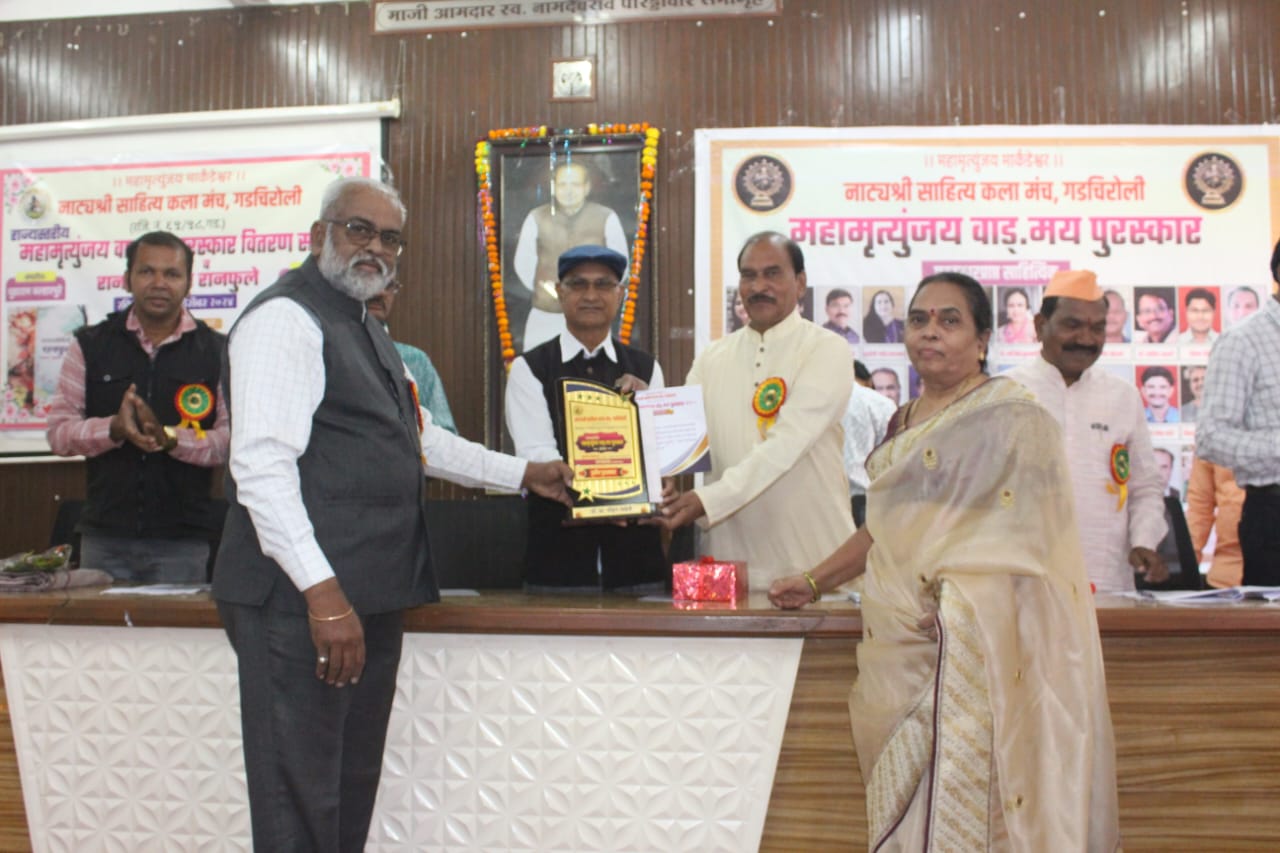 नाट्यश्रीच्या वतीने मराठी साहित्यिकांसाठी नुकतीच ‘महामृत्युंजय वाड्.मय स्पर्धा’घेण्यात आली. या स्पर्धेत महाराष्ट्र व महाराष्ट्राबाहेरील एकूण ३४५साहित्यिक यांनी सहभाग नोंदविला होता. व परिक्षणाअंती ३६ साहित्यिकांची पुरस्कारासाठी निवड करण्यात येवून त्यांना काल गडचिरोली येथे झालेल्या विशेष व सोहळ्यात रोख रक्कम, सन्मानचिन्ह, सन्मानपत्र, ग्रंथभेट, शाल व श्रीफळ देऊन गौरविण्यात आले.