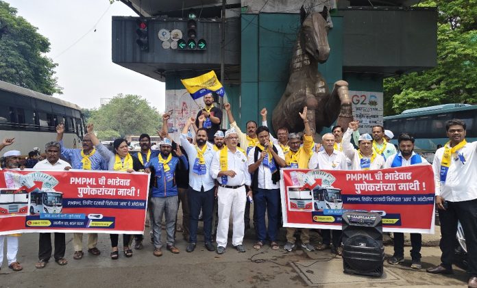 पुणे : पुण्याची सार्वजनिक वाहतूक व्यवस्था सांभाळणाऱ्या पीएमपीएमएल ने तिकीट दरात मोठी वाढ केली आहे. संचालक मंडळाने याबाबत ठराव करून बसचा किमान तिकीटदर ५ रुपये ऐवजी १० रुपये केला आहे. तसेच दैनंदिन पास ४० रुपये वरून वाढवून ७० रुपये केला आहे आणि मासिक पास मध्ये ९०० रुपयावरून तब्बल १५०० रुपये पर्यंत दरवाढ केली आहे. ही दरवाढ सामान्य पुणेकरांची कंबर मोडणारी आहे. असे सांगत आज रविवार रोजी सकाळी आम आदमी पार्टी तर्फे पुणे येथे स्वारगेट चौकामध्ये जोरदार आंदोलन करण्यात आले.