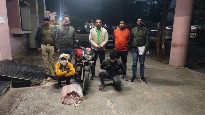 चिमूर :- चिमूर पोलीसांनी मिळालेल्या गोपनिय माहितीचे आधारे पोलीस स्टेशन चिमूर हद्दीत भय्युजी शाळे समोरील रोडवर नाकाबंदी करुन एक मोटार सायकल क्रमांक एम. एच.३४-एक्यु-६८२३ ला थांबवुन मोटार सायकल वरील चुंगळीची पंचासमक्ष पाहणी केली असता त्यात एकुण १२३ नग कोकन देशी दारुच्या ९० मी.ली. प्लॉस्टीक शिश्या किंमत ६१५०/- रुपयाचा माल अवैध रित्या वाहतुक करीत असतांना मिळुन आल्याने वाहनावरील इसम नामे (१) एकनाथ महादेव मेश्राम वय ५२ वर्ष (२) राहुल एकनाथ मेश्राम वय २३ वर्ष दोन्ही रा. अलीझंजा ता. चिमूर यांच्याविध्द महाराष्ट्र दारुबंदी कायद्याचे विविध कलमान्वये गुन्हा नोंदविण्यात आला आहे.
