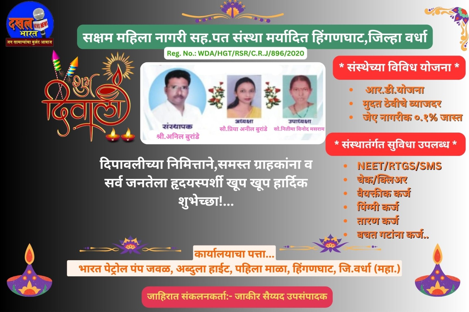 — सक्षम महिला नागरी सह.पत संस्था मर्यादित, हिंगणघाट,जि.वर्धा यांचा Reg. No.: WDA/HGT/RSR/C.R.J/896/2020 असा आहे.—