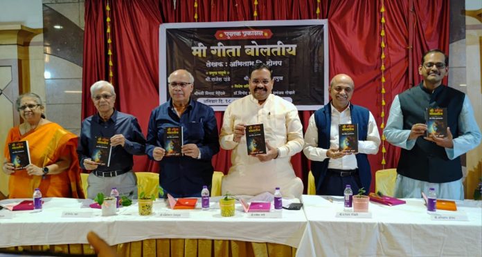 अभिताभ होनप लिखित ‘मी गीता बोलतीय’ या भगवदगीतेचे उत्कंठावर्धक वर्णन करणाऱ्या पुस्तकाचा प्रकाशन सोहळा पार पडला. यावेळी भारतीय पुस्तक न्यासाचे विश्वस्त राजेश पांडे, गीता धर्म मंडळाच्या कार्यवाह विनया मेहंदळे, लेखक धनंजय गोखले, जनसेवा फौंडेशन चे अध्यक्ष डॉ.विनोद शहा, लेखक अभिताभ होनप उपस्थित होते. यावेळी धनंजय गोखले, डॉ.शहा आणि विनया मेहेंदळे, यांनी पुस्तकामागील भूमिका मांडली.