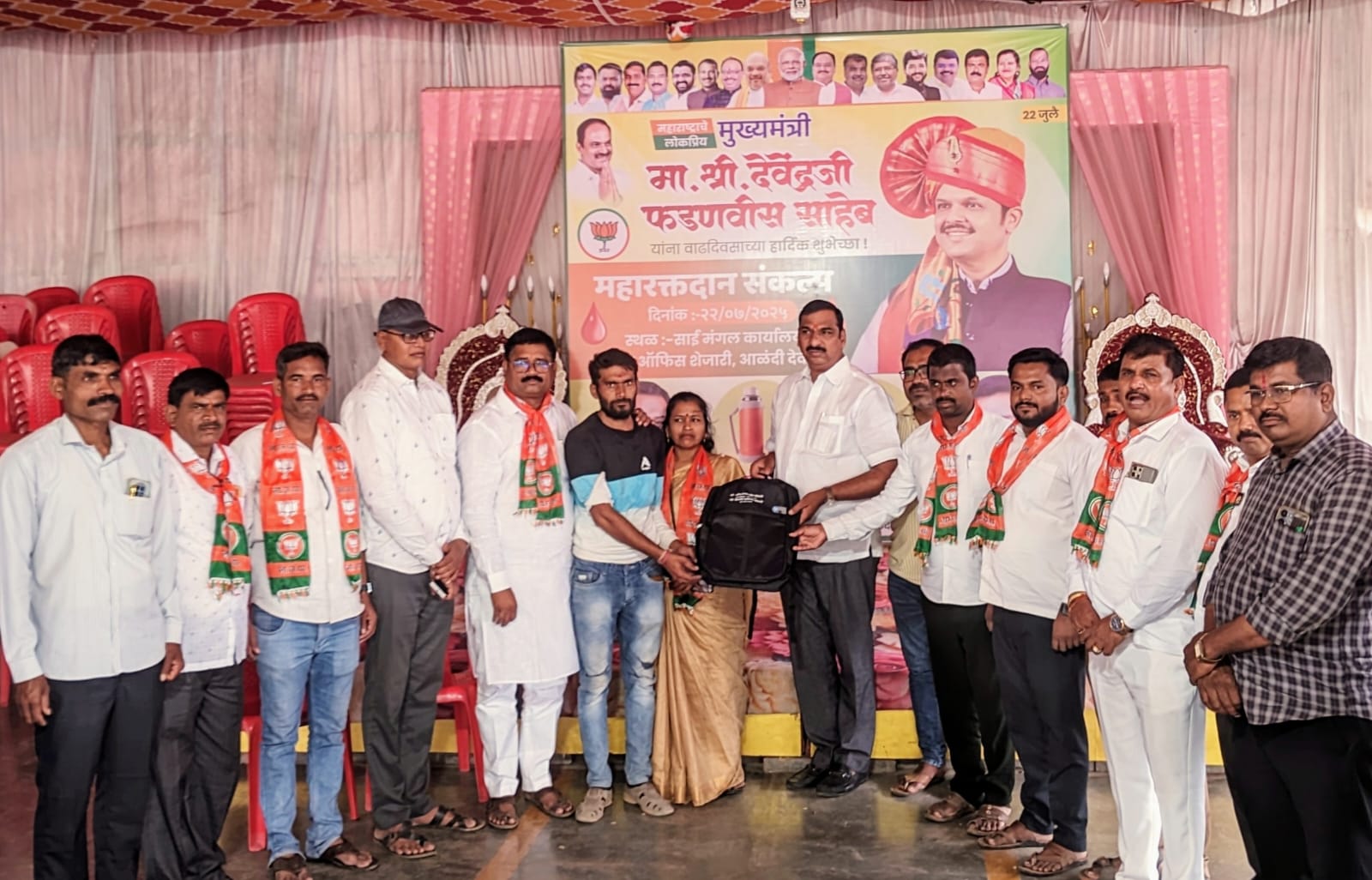 आळंदी :– महाराष्ट्र राज्याचे लोकप्रिय मुख्यमंत्री नामदार देवेंद्रजी फडणवीस यांच्या वाढदिवसानिमित्त भारतीय जनता पार्टी महाराष्ट्र प्रदेशच्या वतीने राज्यभरात एकाच वेळी महा रक्तदान शिबिराचे आयोजन करण्यात आले. या उपक्रमाचा एक भाग म्हणून आळंदी ग्रामीण मंडळाच्या वतीने साई मंगल कार्यालय, आळंदी देवाची येथे भव्य रक्तदान शिबिराचे आयोजन करण्यात आले होते.