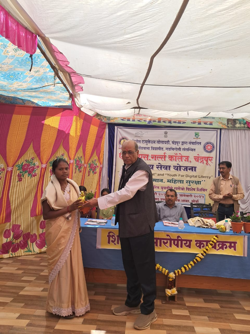शिबीरामध्ये उत्कृष्ट कार्य केल्याबद्दल कु.खूशी शर्मा, दिव्या खांडकुरे, दिव्या वाघमारे,आरती चिटलवार, सरोज देवगडे,गौरी बोबडे, मित्तल कांबळे या रासेयो स्वंयसेवीकाचा मान्यवरांच्या हस्ते सत्कार करण्यात आला.